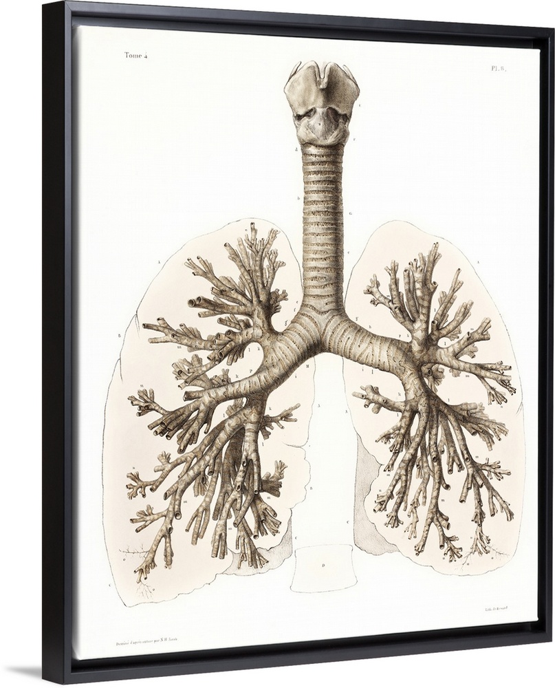 <p>Respiratory anatomy, 19th Century artwork. Historical hand coloured lithographic print showing the trachea (wind pipe, vertical) running down from the larynx (voicebox, top centre) and branching (centre) into the two bronchi. These then branch further into numerous bronchioles inside each lung (left and right). Image from 'Traite complet de l'anatomie de l'homme, comprenant la medecine operatoire' Vol. 4 (1836), by Jean-Baptiste Marc Bourgery and illustrated by Nicolas-Henri Jacob.</p>