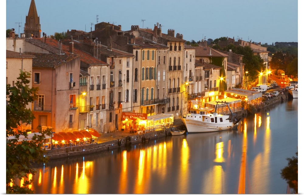 <p>Restaurants along the l'Herault river. L'Herault river. A fishing boat. Agde town. Languedoc. France. Europe.</p>