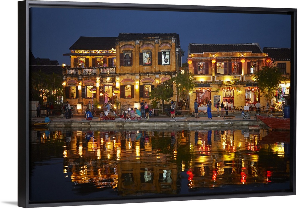 <p>Restaurants and tourists reflected in Thu Bon River at dusk, Hoi An (UNESCO World Heritage Site), Vietnam</p>