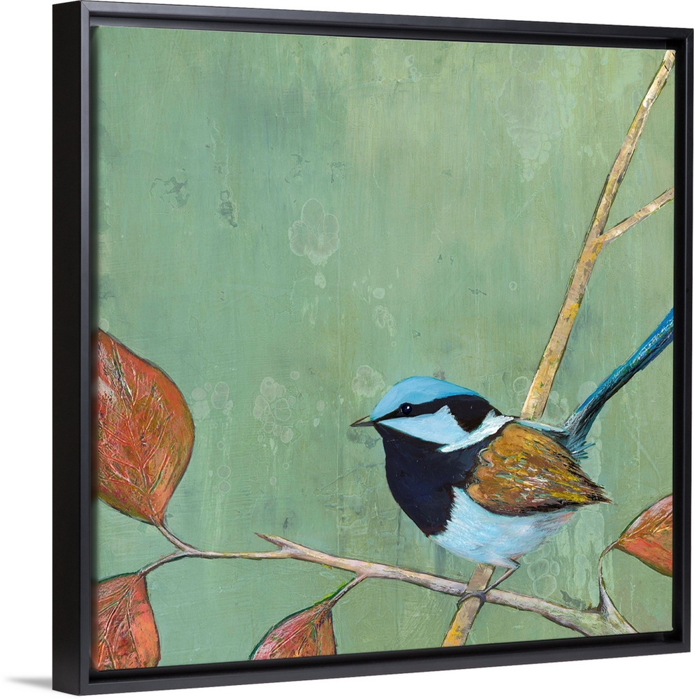 <p>A painting of a garden bird perched on a branch with fall leaves, against a green background.</p>