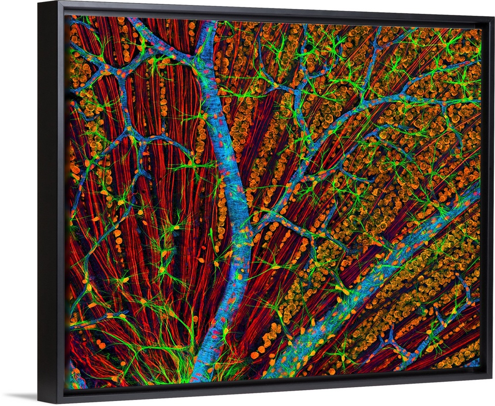 <p>Retina blood vessels and nerve cells. Confocal light micrograph of the retina, the light-sensitive membrane that lines the back of the eyeball. The tissue has been fluorescently stained. Ganglion cells (orange) receive visual information from photoreceptors beneath this surface, which is relayed to the brain by optic nerve fibres (red). Glial cells (green) offer structural support to the nerve cells. Blood vessels (blue) form branching networks across the retina to supply it with oxygen and nutrients. Magnification: 160x when printed 10 centimetres across.</p>