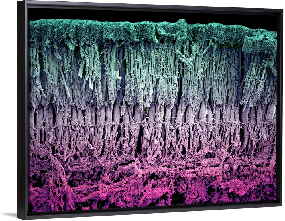 <p>Retina layers, coloured scanning electron micrograph (SEM). The retina of the human eye is found on the inside of the eyeball and is formed from a number of layers. The light-detecting part is formed of rod and cone photoreceptor cells. The lower third of this image contains the blood vessels and nerves that form the upper layer. The light entering our eyes has to penetrate though this layer to reach the tightly packed photosensitive 'outer segments' of the photoreceptors (top third of image) which lie just below a layer of retinal pigment epithelium cells (top). Magnification: x480 when printed at 10 centimetres across.</p>