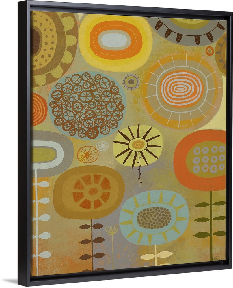 <p>Contemporary painting with a retro feel of colorful shapes and designs making a flowery garden scene.</p>