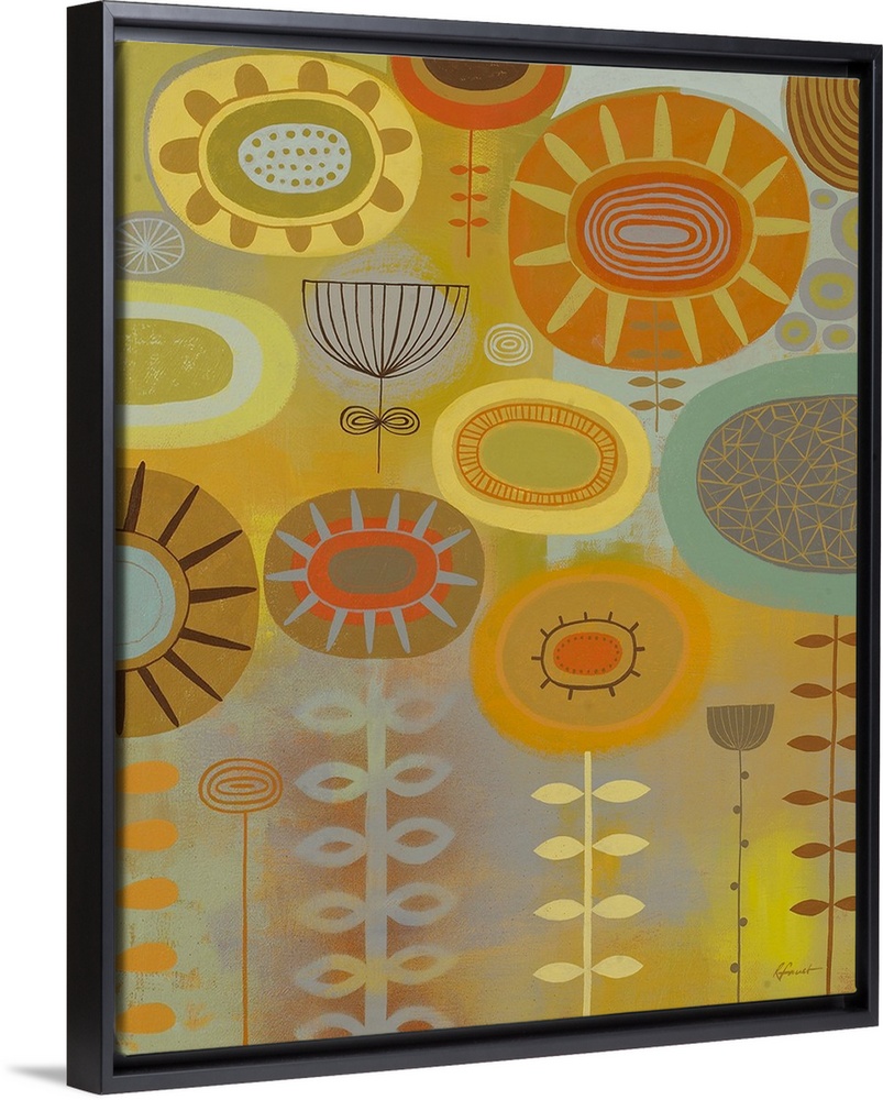 <p>Contemporary painting with a retro feel of colorful shapes and designs making a flowery garden scene.</p>