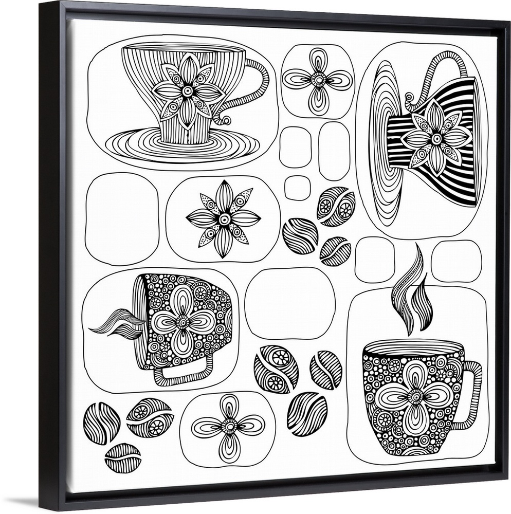 <p>Contemporary line art of coffee cups in rounded geometric boxes against a white background.</p>