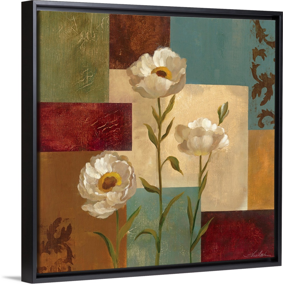 <p>Painting by artist Silvia Vassileva of three poppies on a background of colored squares.</p>