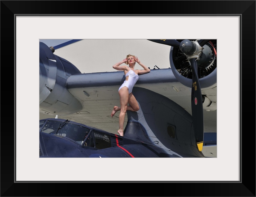 <p>Retro pin-up girl posing with a World War II era PBY Catalina seaplane.</p>