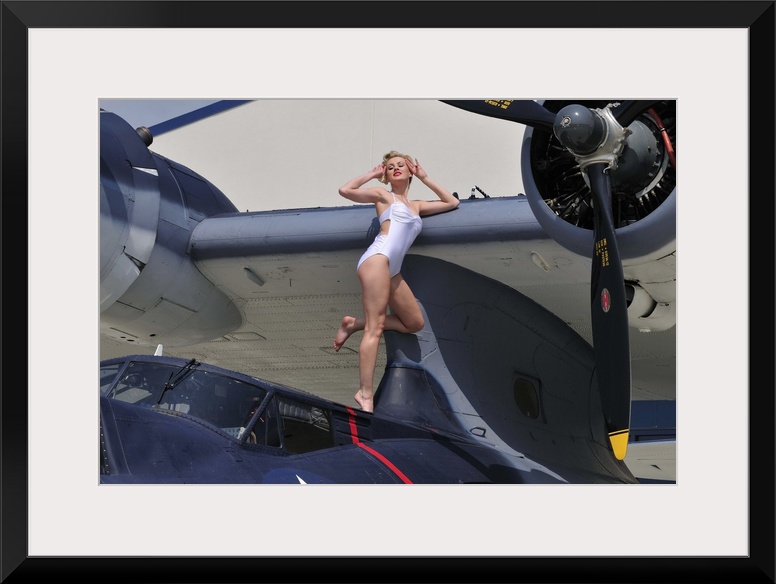<p>Retro pin-up girl posing with a World War II era PBY Catalina seaplane.</p>