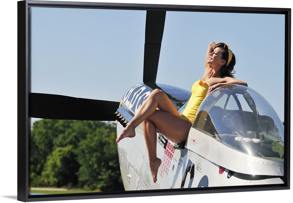 <p>Retro pin-up girl sitting outside the cockpit of a World War II era P-51 Mustang.</p>