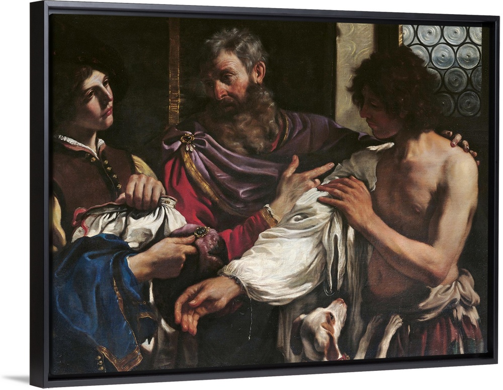<p>The Return of the Prodigal Son, by Giovan Francesco Barbieri known as il Guercino, 1627 - 1628, 17th Century, oil on canvas, cm 125 x 163 - Italy, Lazio, Rome, Borghese Gallery. All. Father son return dog ring recognise window glass circles clothes servan</p>