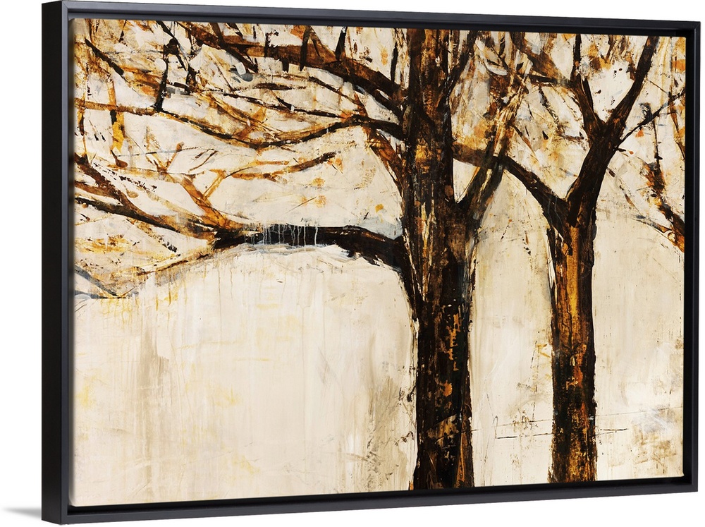 <p>Contemporary artwork of a line of three bare trees painted against an off white background.</p>