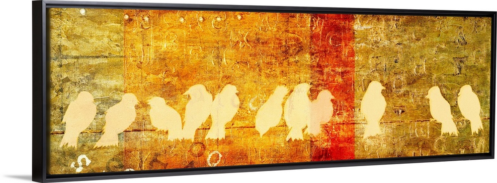 <p>Panoramic artwork of eleven bird silhouettes on a wire with an abstract background.</p>