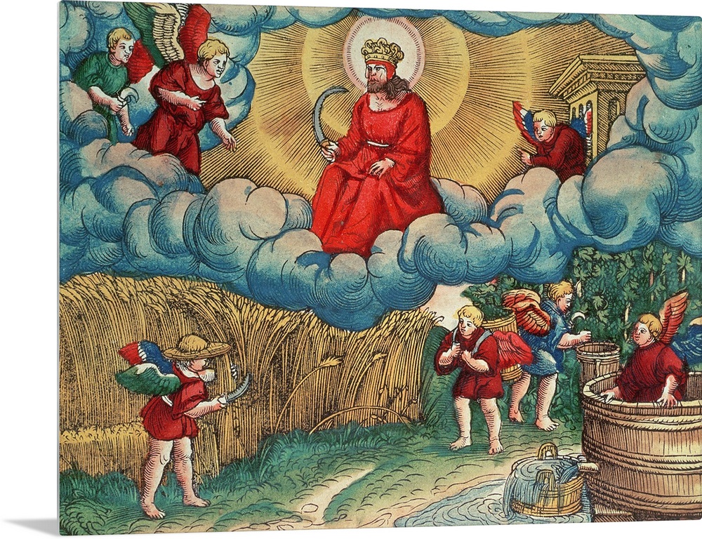 <p>Revelations 14:14 The Reaper, Vision of Armageddon, from the Luther Bible, c.1530 (originally a coloured woodcut) by German School, (16th century).</p>