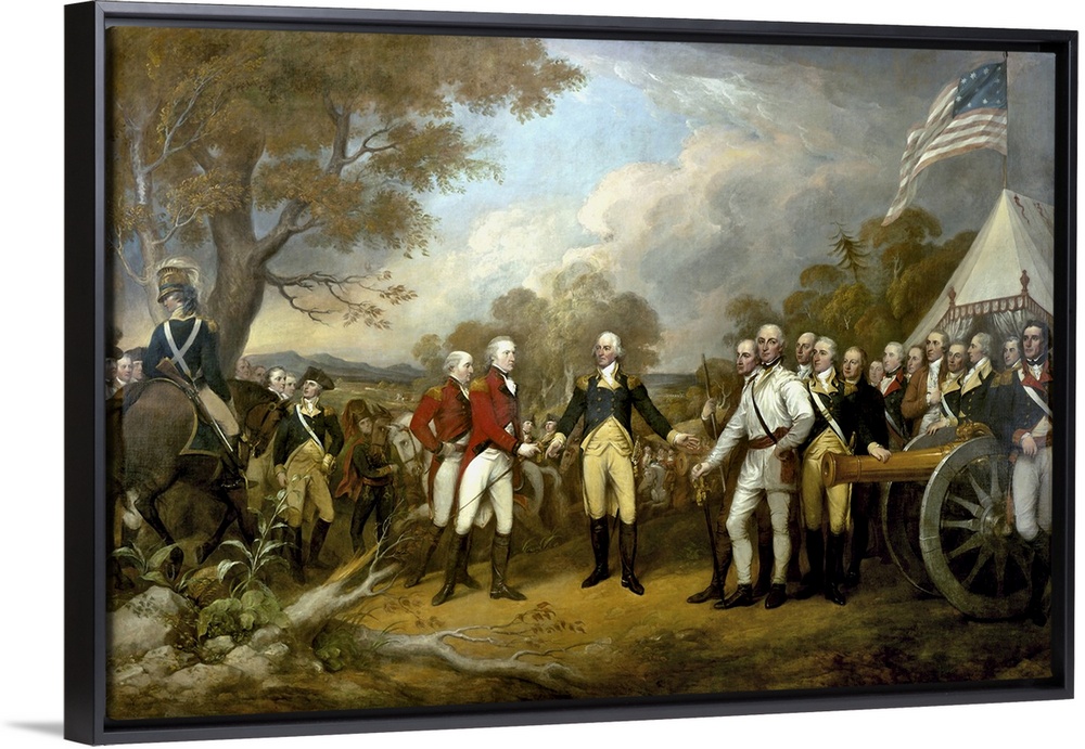 <p>Revolutionary War Painting showing the surrender of British General John Burgoyne at Saratoga, on October 17, 1777. This action prevented the British from dividing New England from the rest of the colonies. Featured men include British Generals William Phillips and John Burgoyne, Americans Daniel Morgan and Horatio Gates.</p>