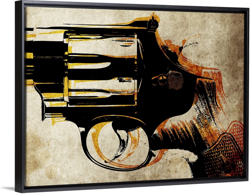 <p>Horizontal, pop art work of close up of a .44 Magnum handgun.</p>