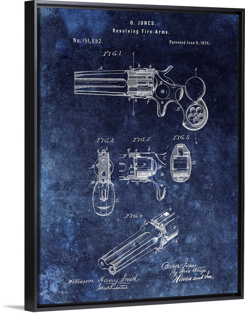<p>Antique style blueprint diagram of a Revolving Fire Arms printed on a blue background.</p>