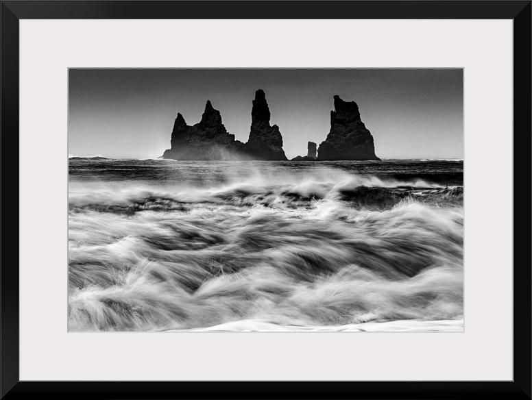 <p>The Reynisdrangar rock stacks and stormy seas, from the beach at Vik y Myrdal, South Iceland.</p>