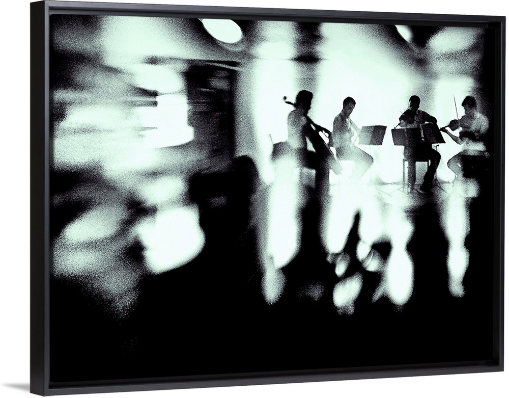 <p>A quartet of musicians plays a piece, surrounded by blurred lights and shadows.</p>