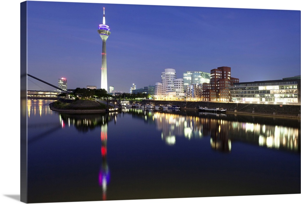 Rheinturm Tower and Gehry buildings at dusk, Media Harbour, Dusseldorf, Germany