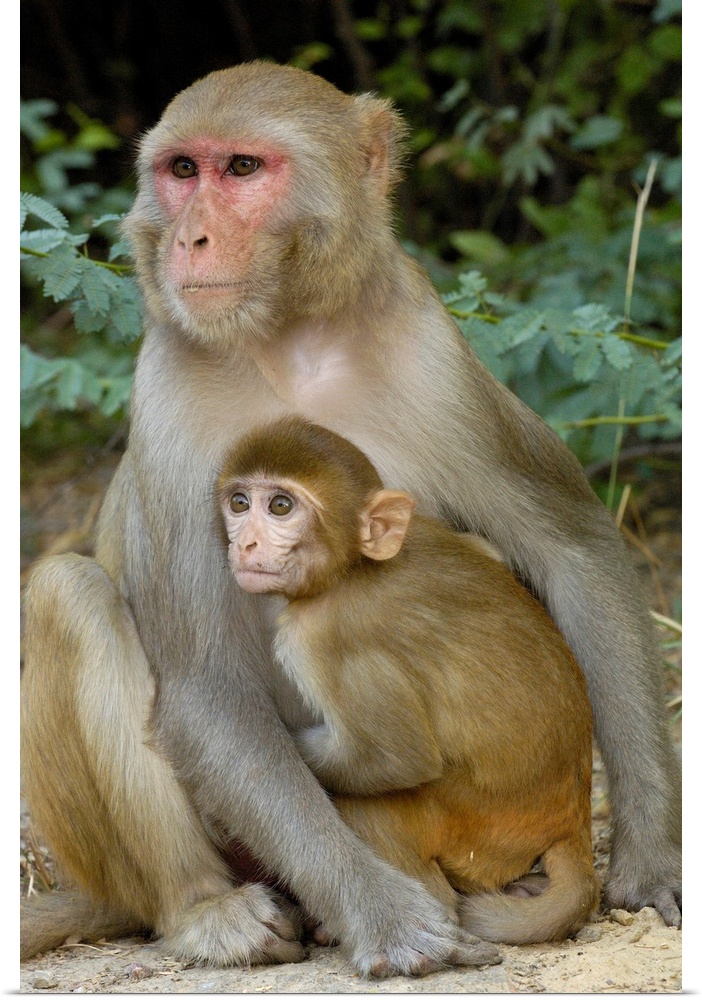 <p>Rhesus Macaques (Macaca mulatta) mother & baby in Bharatpur National Park or Keoladeo Ghana Sanctuary. Rajasthan. INDIA.</p>