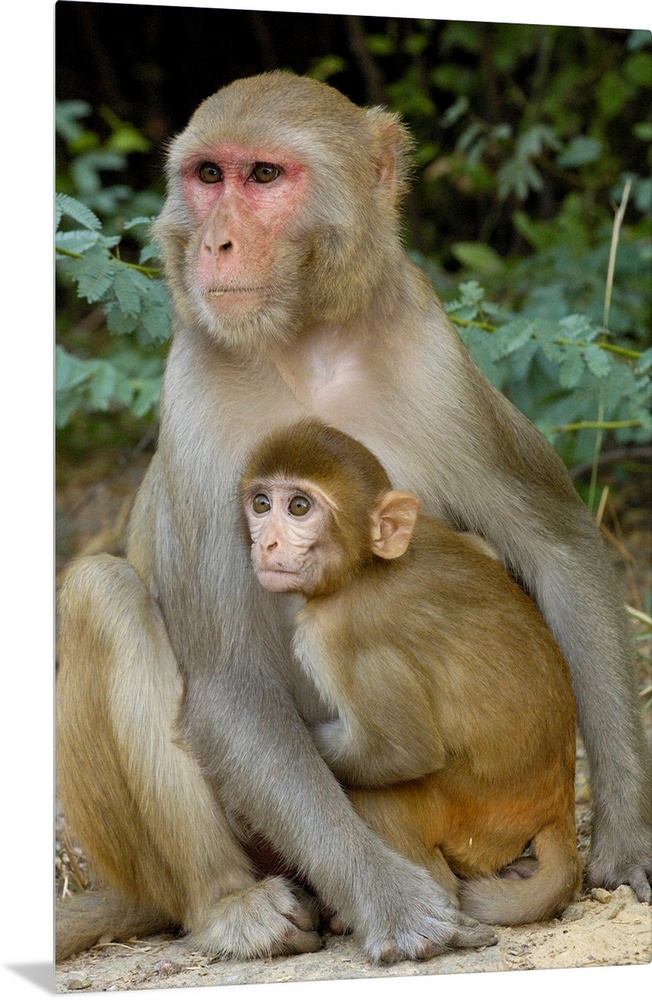 <p>Rhesus Macaques (Macaca mulatta) mother & baby in Bharatpur National Park or Keoladeo Ghana Sanctuary. Rajasthan. INDIA.</p>