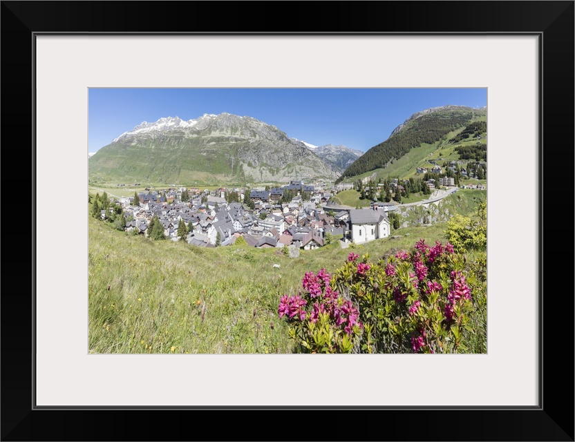 <p>Rhododendrons frame the alpine village of Andermatt, surrounded by woods, Canton of Uri, Switzerland, Europe</p>