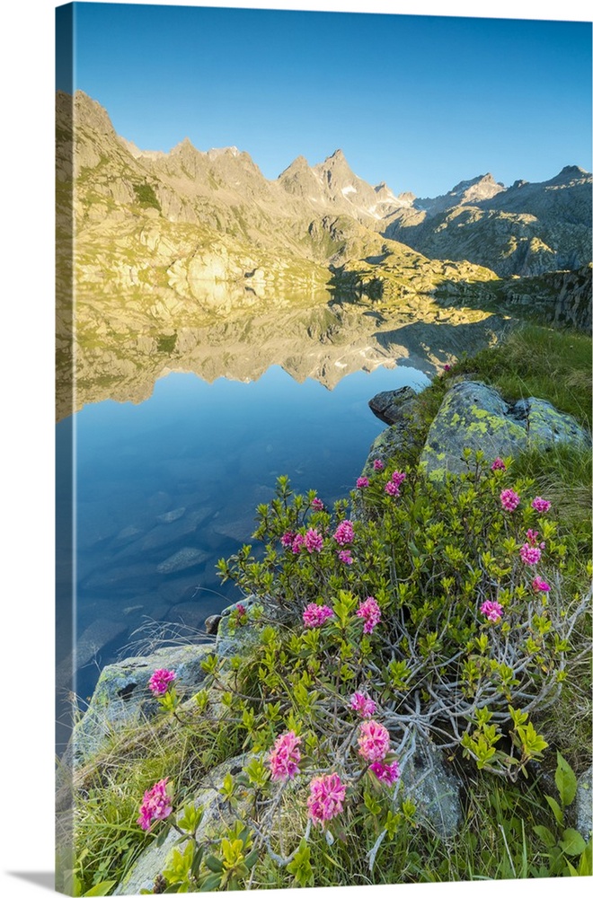 <p>Rhododendrons frame the blue water of Lago Nero at dawn, Cornisello Pinzolo, Brenta Dolomites, Trentino-Alto Adige, Italy</p>