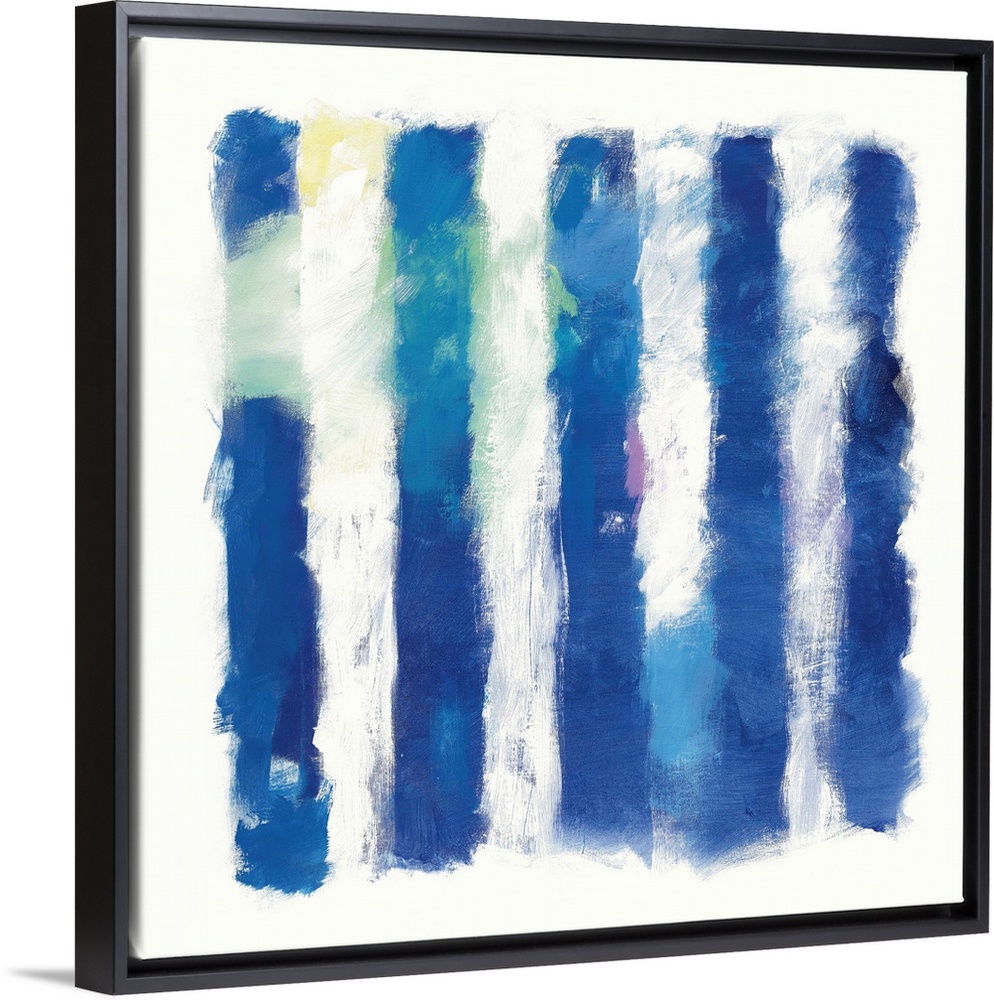 <p>Abstract art of deep blue vertical stripes on white.</p>