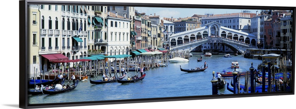 <p>Panoramic photograph of waterway filled with gondolas and lined with shops and buildings, with overpass in distance.</p>