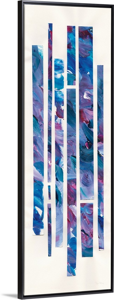 <p>Large geometric abstract painting with long, rectangular, vertical lines in cool shades of blue, purple, and red on a white background.</p>