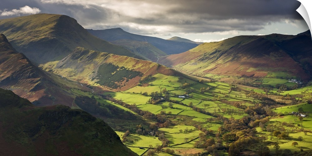 <p>Rich autumn sunlight illuminates Newlands Valley in the Lake District, Cumbria, England.</p>