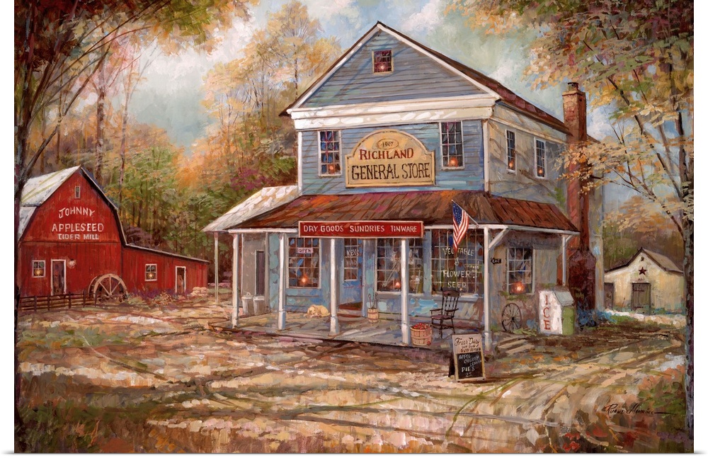 <p>Contemporary painting of a countryside General Store and a Cider Mill in Autumn.</p>