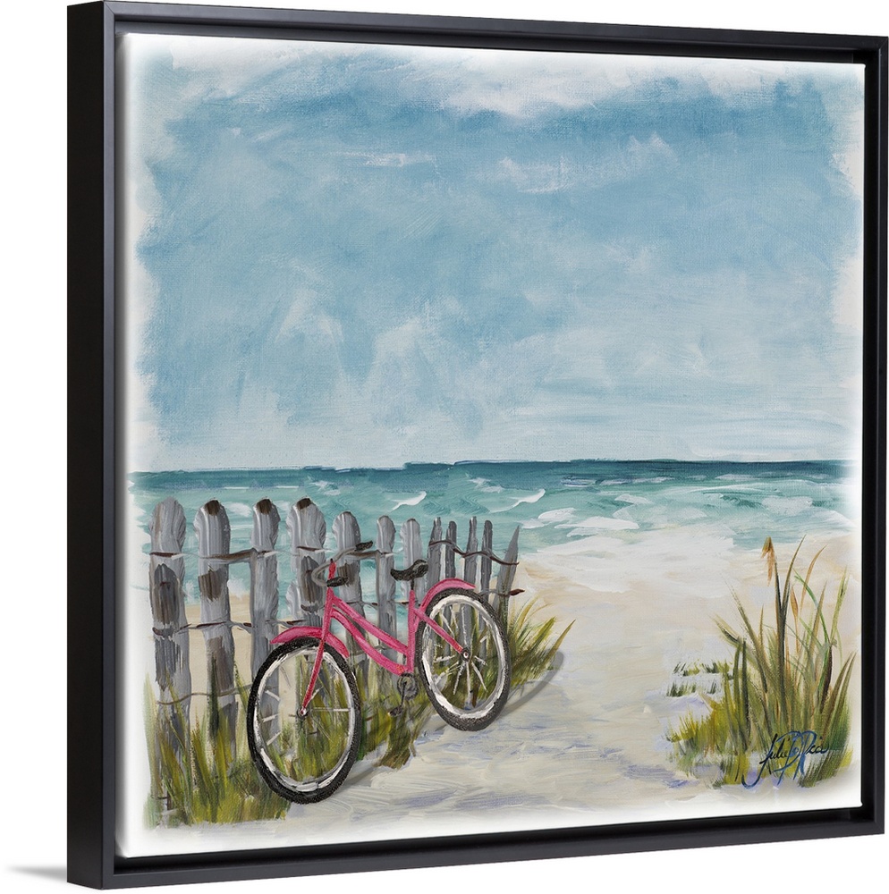 <p>Square painting of a red bicycle leaning against a wood picket fence on a sandy pathway leading to the ocean.</p>