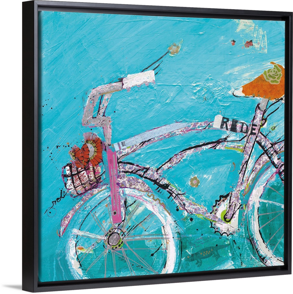 <p>Energetic brush strokes, heavy textures and cut paper create a decorative artwork of bicycle.</p>