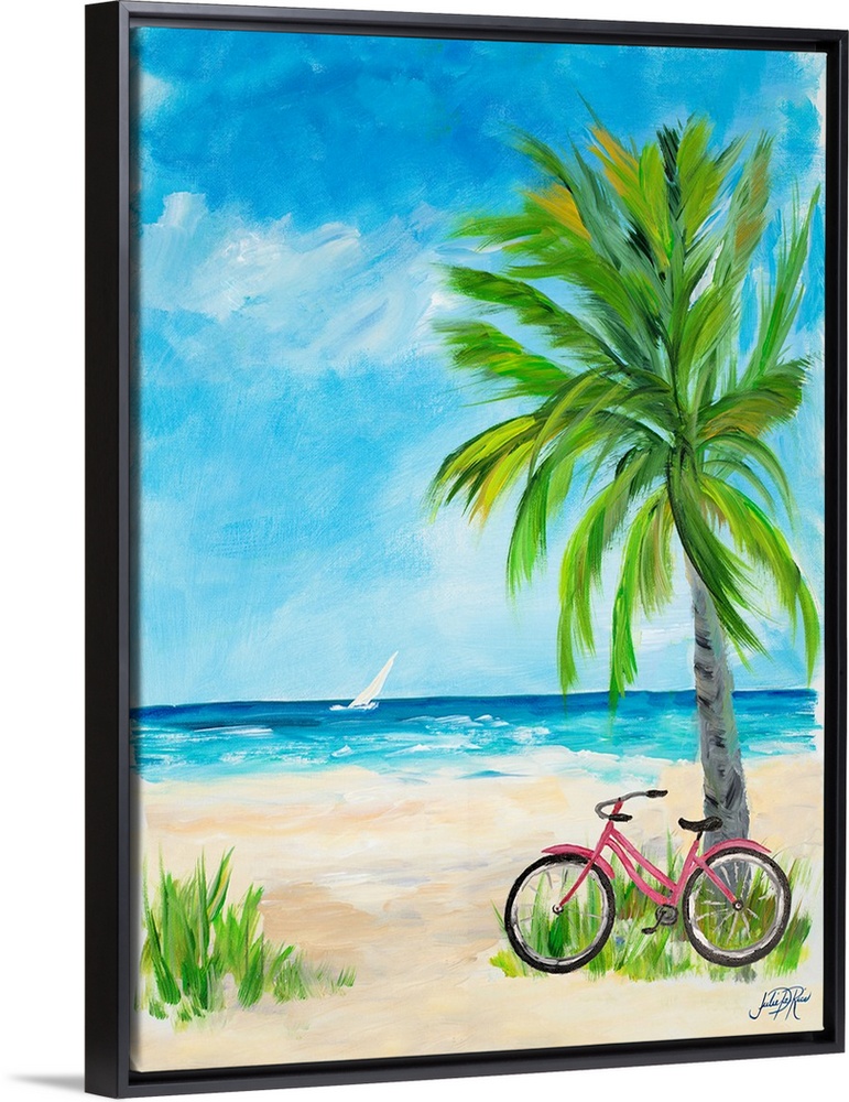 <p>Contemporary painting of a red bicycle leaning up against a palm tree on a sandy beach with a white sailboat in the distance.</p>