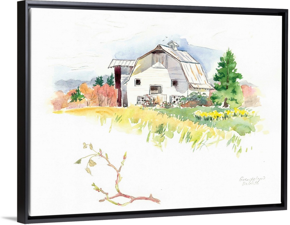 <p>Watercolor landscape painting of a white barn with beautiful scenery.</p>