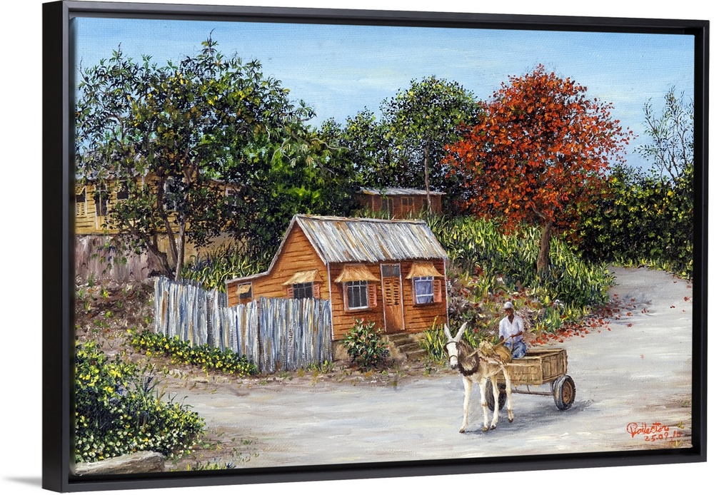 <p>An oil painting of small huts surrounded by trees with a road in front that has a man being pulled in a cart by a mule.</p>