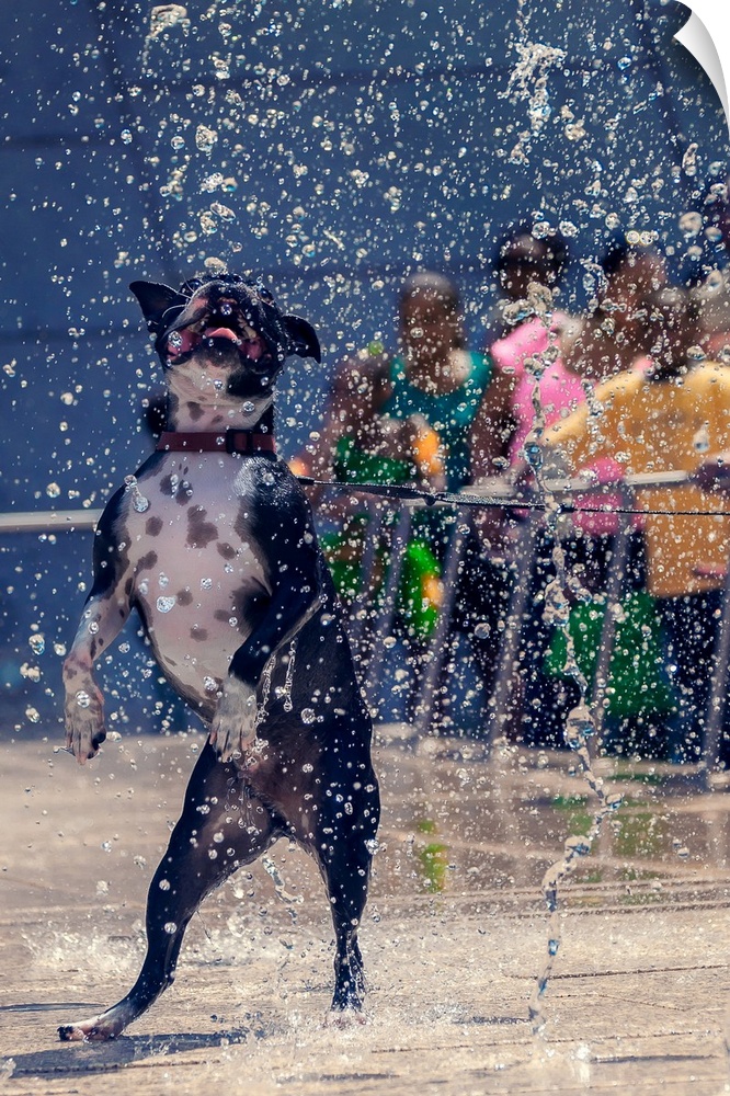 <p>A dog happily playing in the fountains of a splash pad at a park.</p>