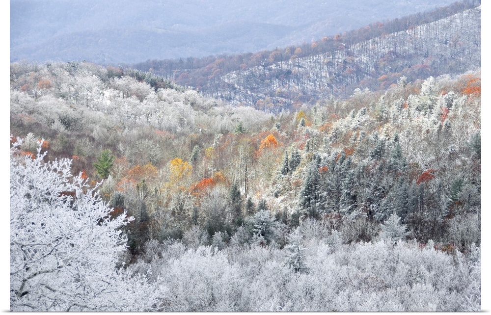 <p>Rime Ice melts away revealing fall colors on the trees below</p>