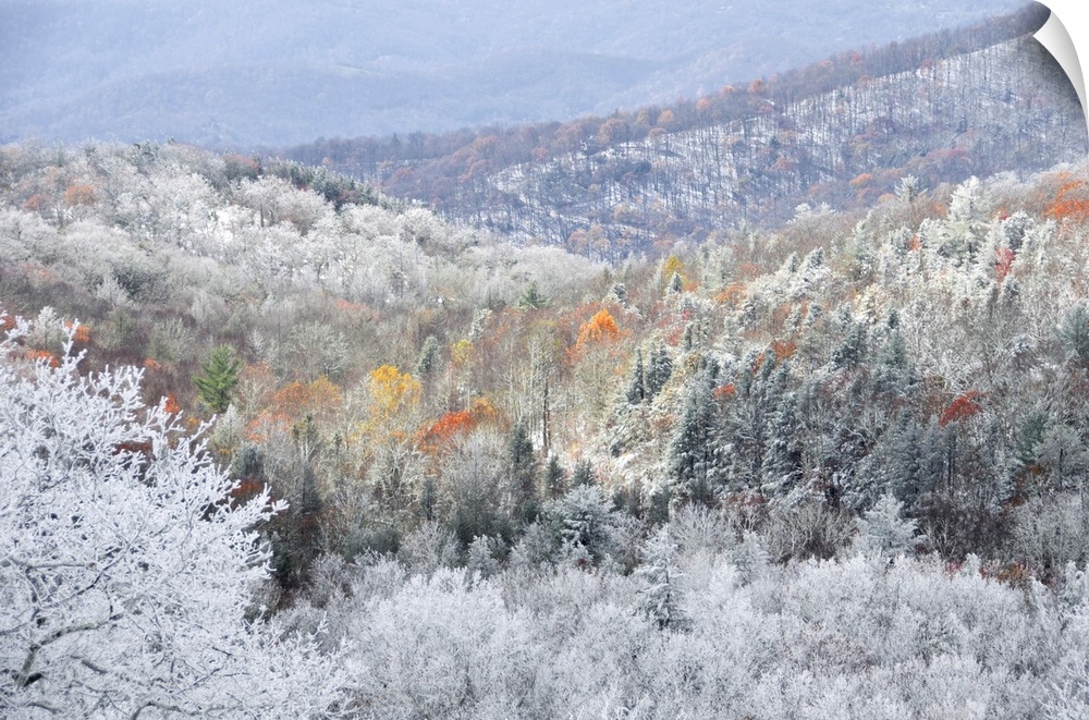 <p>Rime Ice melts away revealing fall colors on the trees below</p>