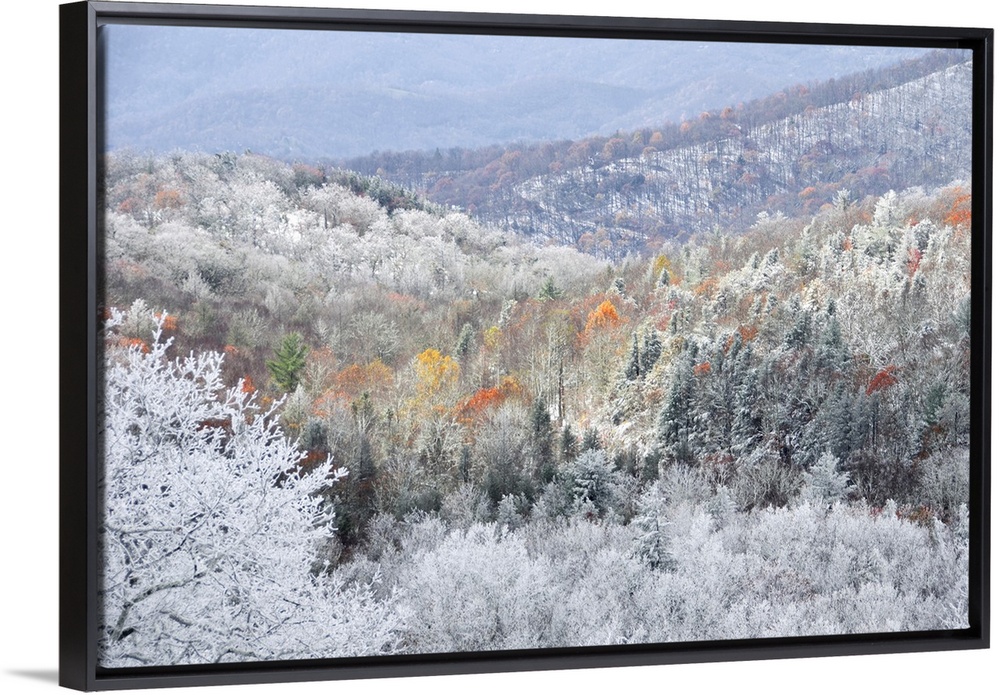 <p>Rime Ice melts away revealing fall colors on the trees below</p>