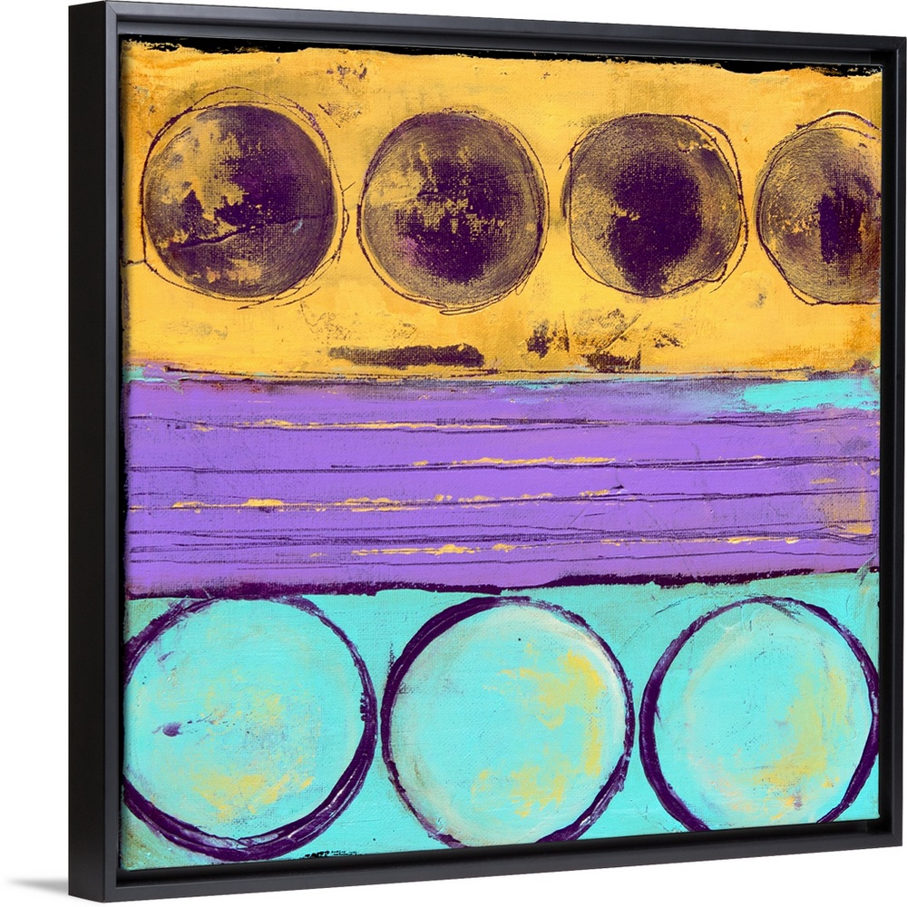 <p>A square contemporary abstract painting that consists of two rows of circular shapes divided by a series of horizontal lines. You can find light and dark purples, light blue, and yellow throughout the painting with a bit of black on the edges.</p>
