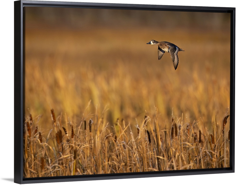 <p>A ringneck duck flies over Anchorage's Potter Marsh on a late September day prior to fall migration. Part of the Anchorage Coastal Wildlife Refuge managed by the State of Alaska Department of Fish and Game, Potter Marsh is a very popular bird- and wildlife-viewing destination.</p>