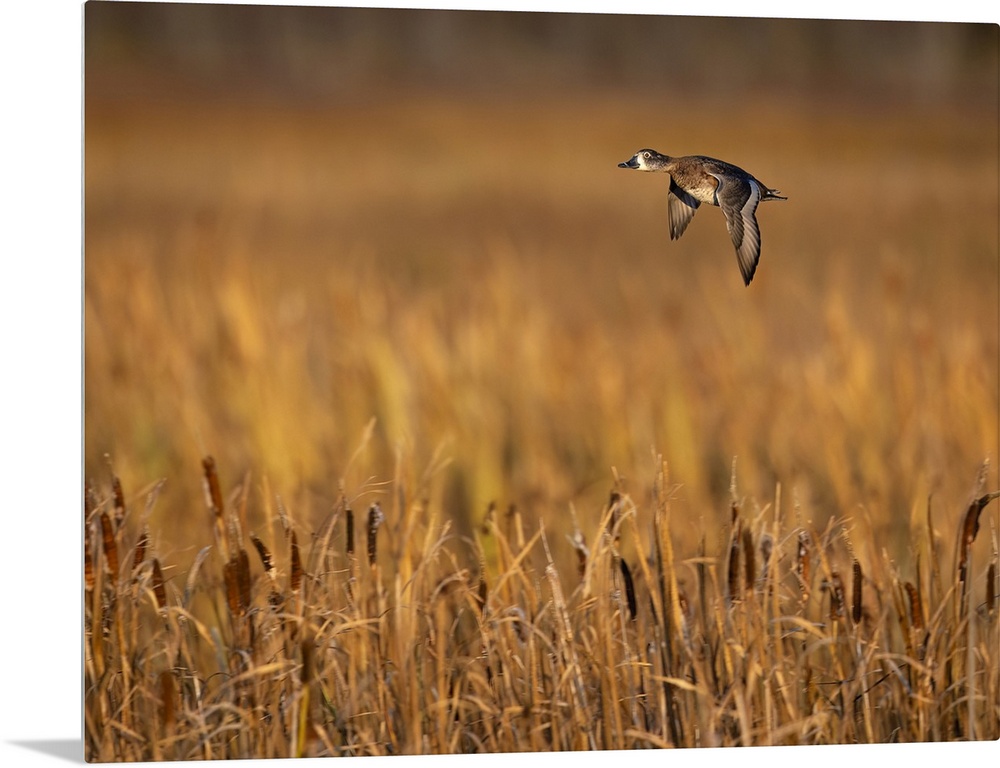 <p>A ringneck duck flies over Anchorage's Potter Marsh on a late September day prior to fall migration. Part of the Anchorage Coastal Wildlife Refuge managed by the State of Alaska Department of Fish and Game, Potter Marsh is a very popular bird- and wildlife-viewing destination.</p>