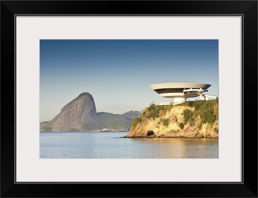 <p>South America, Rio de Janeiro, Niteroi, Oscar Niemeyer's Contemporary Art Museum (MAC Niteroi) in the late afternoon light, with Guanabara Bay and the Sugar Loaf (Pao de Acucar) in the background</p>