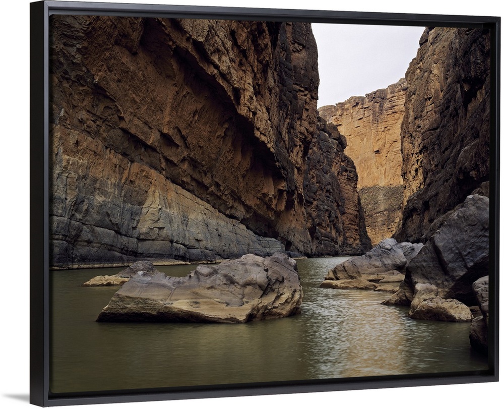 <p>Photo print of a rugged canyon with water flowing by big rocks at the bottom.</p>