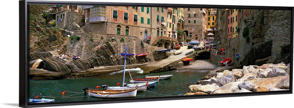 <p>Panoramic photograph showcases a group of small boats sitting and entering an inlet surrounded by steep cliffs and homes within a European country.</p>