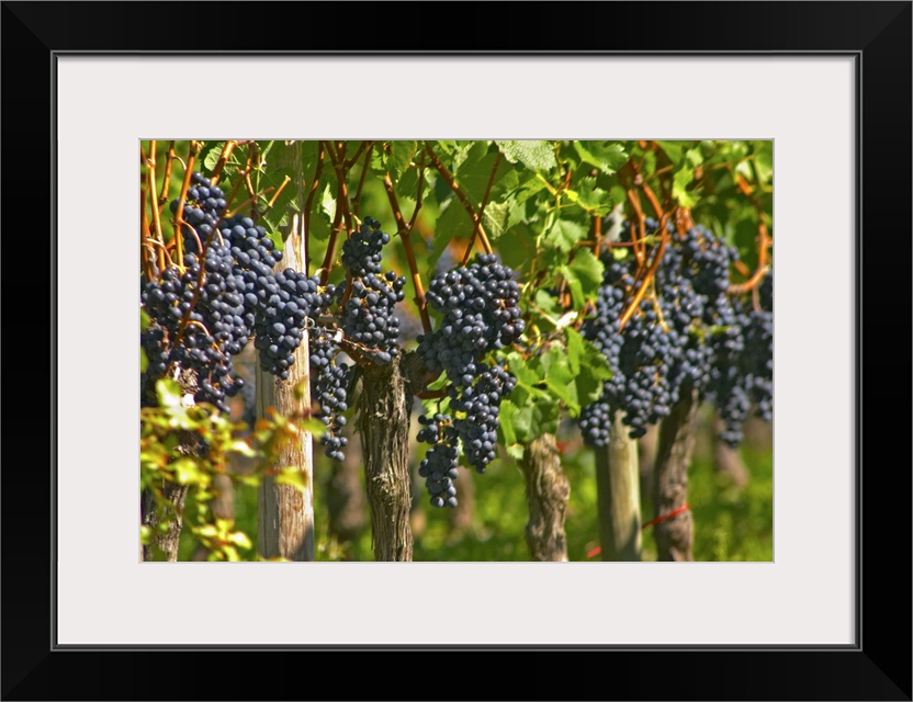 <p>Ripe bunches of Merlot grapes in a row in the vineyard - Chateau Grand Mayne, Saint Emilion, Bordeaux</p>