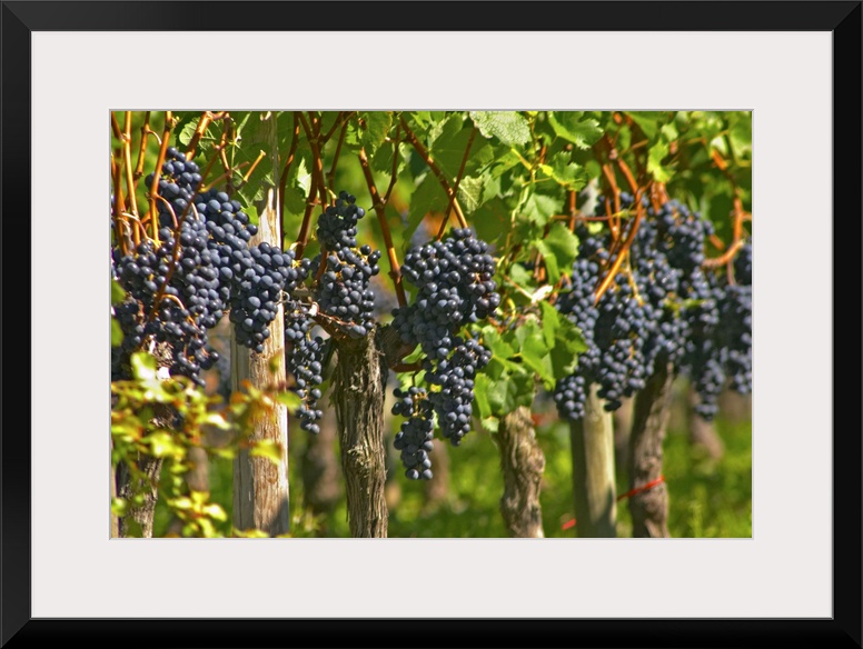 <p>Ripe bunches of Merlot grapes in a row in the vineyard - Chateau Grand Mayne, Saint Emilion, Bordeaux</p>