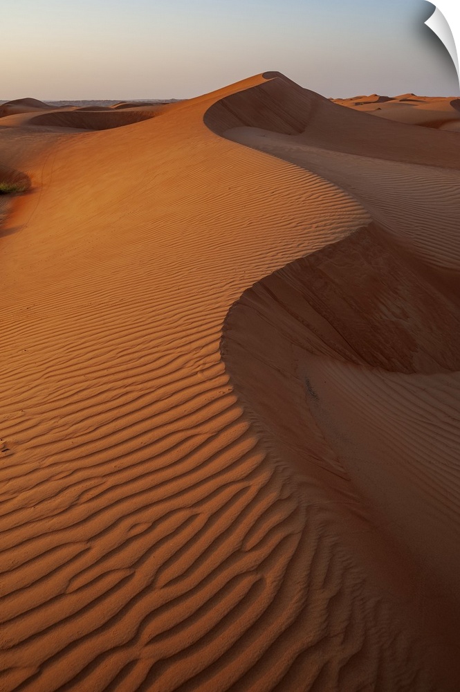 <p>Rippled dunes in the Wahiba Sands at sunset. Wahiba Sands, Arabian Peninsula, Oman.</p>